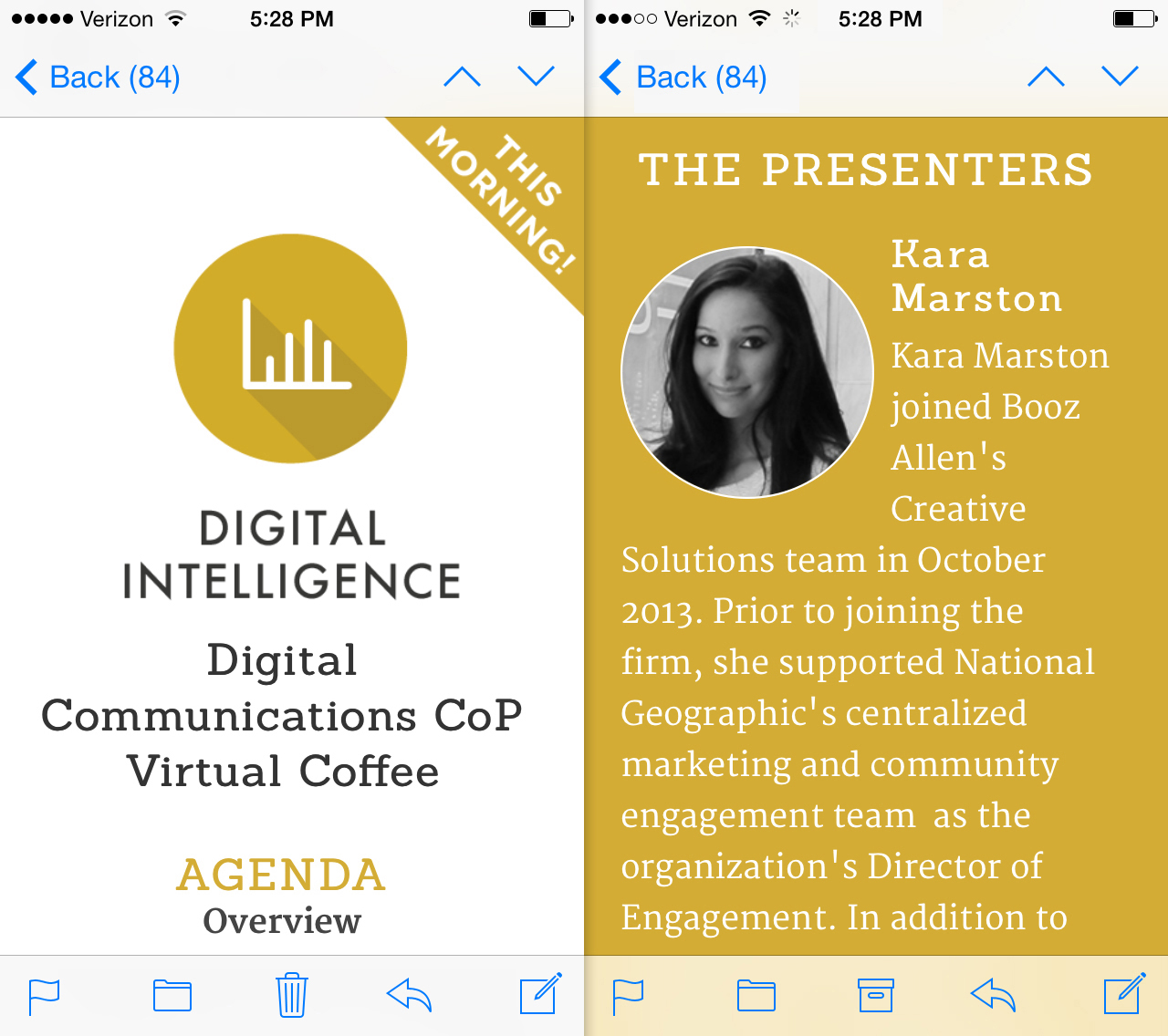 From 2007 to 2014, I was an art director for Booz Allen Hamilton. And from 2014 to 2024, I worked for two Silicon Valley tech companies, MarkLogic and Redis. In June, I joined Guidehouse.